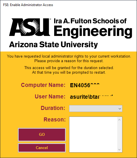 Elevate Admin is an application to temporarily grant faculty & staff administrative level user account access on a local workstation, notify an IT unit, and document the elevated permission. Faculty & staff can use this application when currently logged-in as a non-administrative user to perform administrative tasks on the local computer.